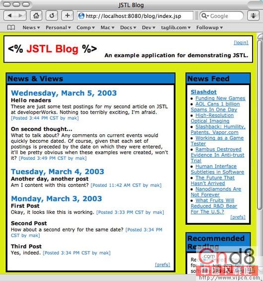 为了演示 JSTL 标记,我们将使用来自一个工作应用程序的示例,本系列中余下的文章都将使用此应用程序。由于基于 Java 的 Weblog 日渐流行及为人们所熟悉,因此我们将出于此目的使用一个简单的基于 Java 的 Weblog;参阅参考资料以下载该应用程序的 jsp 页面和源代码。Weblog(也称为 blog)是一种基于 Web 的简短注释的日志,这些注释是有关 Weblog 的作者所感爱好的主题,通常带有与 Web 上其它地方的相关文章及讨论的链接。图 1 中显示了该应用程序正在运行时的抓屏。
