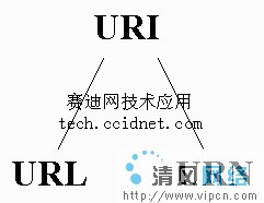 体系中的URI、URL和URN是彼此关联的。URI的范畴位于体系的顶层,URL和URN的范畴位于体系的底层。这种排列显示URL和URN都是URI的子范畴,如图1所示: