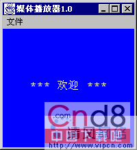 媒体播放器的用户界面包含一个主窗口、一个菜单和一个打开文件的对话框。首先我们来看看主窗口的设计。主窗口应该把窗口标题显示为“媒体播放器1.0”,显示“文件”菜单,显示彩色背景的“欢迎”信息。图一显示了程序刚启动时的主窗口。