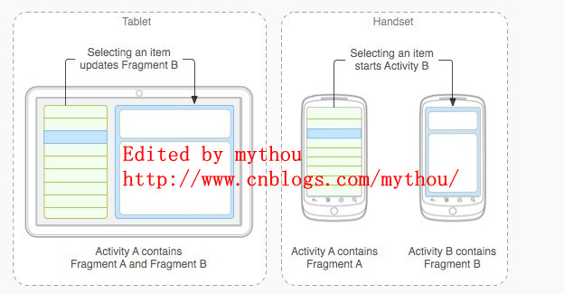 当运行在一个特别大的屏幕时(例如平板电脑),应用可以在Activity A中嵌入2个fragment。但是如果在一个正常尺寸的屏幕(例如手机)上,没有足够的空间同时供2个fragment用, 因此, Activity A会仅包含文章列表的fragment, 而当用户选择一篇文章时, 它会启动ActivityB,它包含阅读文章的fragment.因此, 应用可以同时支持上图中的2种设计模式。