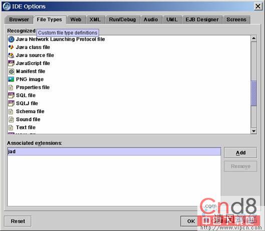上图所示的是File Types页签,这个页签用来设置JBuilder编辑器所认可的文件格式。