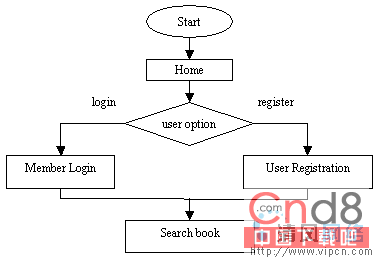 上面的流程图定义了图书馆用户接口的设计。主目录,会员登录,用户注册和书籍检索,这些都是应用
