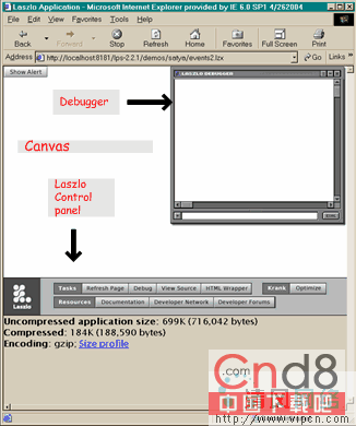 当LZX文件被提交给浏览器,你的浏览器版面将会与图1相同.我把它叫做你的“开发便笺”.这是应用程序开发所必需的.初始设置答应你写一个调试器声明,将它们在调试器窗口显示.这个设置还答应在调试器外有足够的空间以存储视觉控制器.