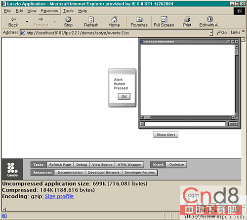 在JavaScript中编程,调用alert()方法进行调试是很平常的. 所以我在Laszlo中寻找可以信赖的alert()方法,不过没有找到.但是却意外地找到一个名为alert的控制器(更确切地说,是一个模态对话框).我猜测我可以利用其来模拟alert功能,当作调试器使用.以下编码是我的尝试.此外,到目前为止,这些编码都是学习LZX的基本特征.