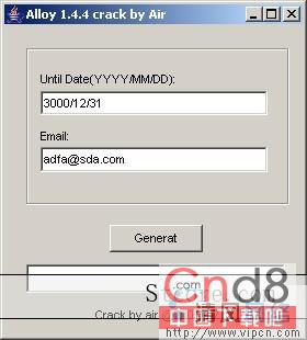 7.好,改成给用1000年的,重新编译class,添回alloy.jar中,再运行,OK!没有对话框了。不过为什么button和toolbar都是红色的,而用试用期的code就是好的?肯定还有限制而且和时间有关,在反编译的文件中找吧,可是找什么要害字呢,先试试RED吧,上百个文件被搜索到,晕!换要害字(于是Color.red,RGB(....都被我试了一遍,每次都是上百个文件被找到),总不能一个个看吧,对了,前面判定时间的类用到了ADD方法,搜ADD(1,1),哈哈,找到了,就一个文件。打开改成1000年,重编译,放到ALLOY.jar中。再在程序中试试,OK了,红色没有了。