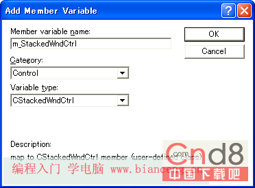 使用MFC ClassWizard添加一个数据变量到IDC_SWC命名为m_StackedWndCtrl,确保选择了Control作为Category以及CStackedWndCtrl作为变量类型。