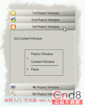 好的,什么将会被显示?该控件用面板制作出来,每个面板包含两个窗体,一个标题窗体和一个内容窗体。下面的图片说明了这个概念。