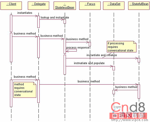 有状态bean可以使用代表了客户的状态,并将它作为附加地属性传递给focus类。Focus类不需要关心是有状态服务的请求还是无状态服务的请求。从有状态bean而来的请求拥有附加的状态信息,因此可以主结果反映出代表客户的任意的会话状态。图2以UML流程图展示了它们之间的关系。