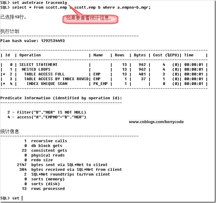 SQL>SET AUTOTRACE TRACEONLY STAT --这样设置只包含有统计信息