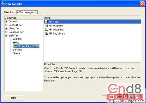 一旦创建了工作区和启动项目,请创建一个新的 jsp。File->New->Web-Tier->JavaServer Pages->JSP Page。