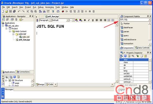 在右侧,您将需要在组件选项板中选择 "JSTL SQL"。(参见下面的红色箭头。)