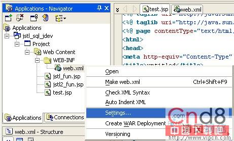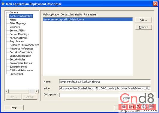 应当指出的是直接在页面中定义数据源将仅用于原型构建或小型非安全性应用程序。对于生产应用程序,您一定要隐藏连接信息。这可以通过在 web.XML 中定义一个上下文参数来实现。这种引用也适用于 JDBC url 或一个现有的容器治理的 JNDI 数据源。配置 JNDI 数据库是容器所特有的,这超出了本文的范围,但在 web.xml 中引用数据源在 JDeveloper 中也可以很轻易地实现。操作方法如下: