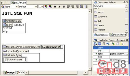 现在我们已经定义了数据,我们可以使用 JSTL Core 标签来显示数据了。在本例中,我们将使用 JSTL Core:"Foreach" 和 "Out" 标签。修改组件选项板,以显示 "JSTL Core" 标签。