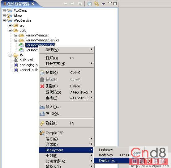 在PersonManager.jar文件上点击右键,在出现的右键菜单上选择Deployment->Deploy to选项,将EJB发布到jboss服务器中,如下如所示