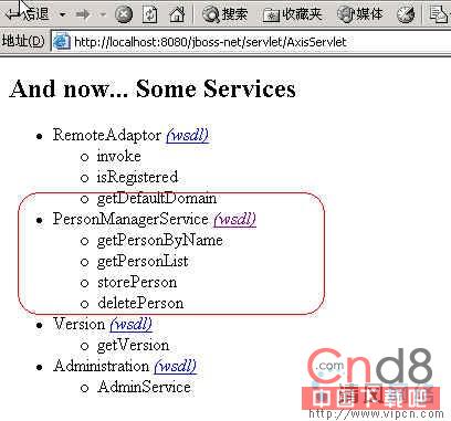 2.检查Web Service是否已经启动。打开浏览器,输入http://localhost:8080/jboss-net/servlet/AxisServlet,出现如下的页面: