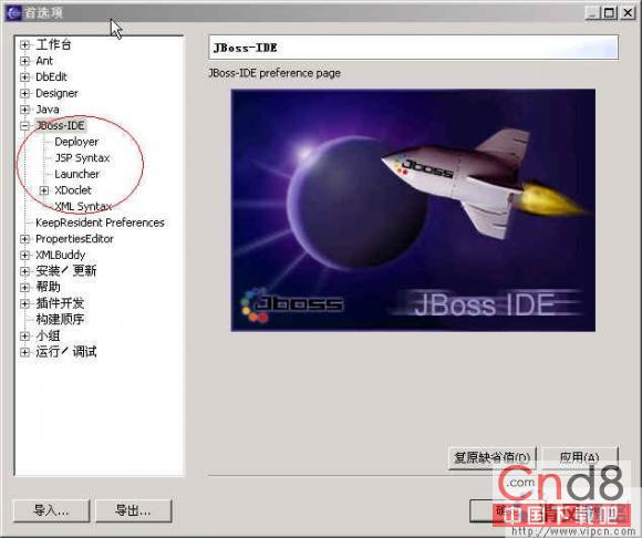 Jboss-IDE是Jboss推荐的一个辅助J2EE开发的Eclipse插件,可以去http://www.jboss.com/prodUCts/jbosside/downloads的官方网站下载,当前版本1.4.1。安装jboss-ide插件的方法和安装其他的标准Eclipse插件没有区别,安装成功之后就可以在首选项中看到Jboss-IDE选项。如下图: