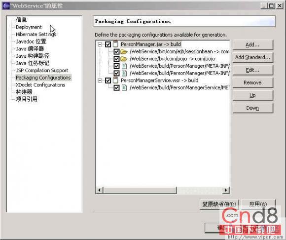 切换到Java透视图模式下,然后在项目名称上点击右键,在出现的右键菜单上选择属性,在出现的窗口中选择Packaging Configuration选项,出现如下的窗口