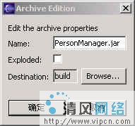 在name框中输入打包jar文档的名称,我们可以输入PersonManager.jar,在Destination中点击Browse按钮,选择当前项目中的bulid目录,这个选项是指定jar文件的输出目录,假如当前项目中没有build目录,请自己创建一个。完成之后点击确定完成;