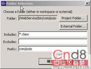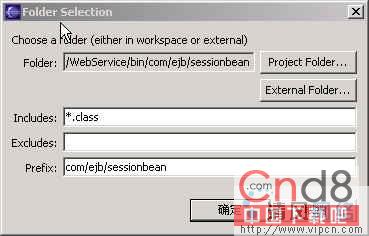 在Folder输入框中选择会话bean的class文件,如:/WebService/bin/com/ejb/sessionbean,在Includes输入框中输入*.class,表示将该目录下的所有class文件进行打包,在perfix中输入class文件的打包路径,如:com/ejb/sessionbean,这个路径必须和类中的package的设置一样,然后点击确定完成。