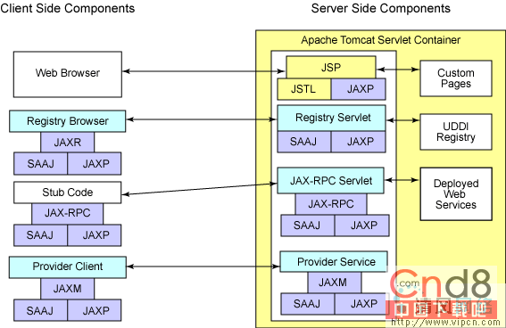 紫色的组件是 Java API for XML(JAX)包的一部分,在 Java XML Pack 中也可以找到它们。大多数 JAX 包都包含可部署的参考实现。