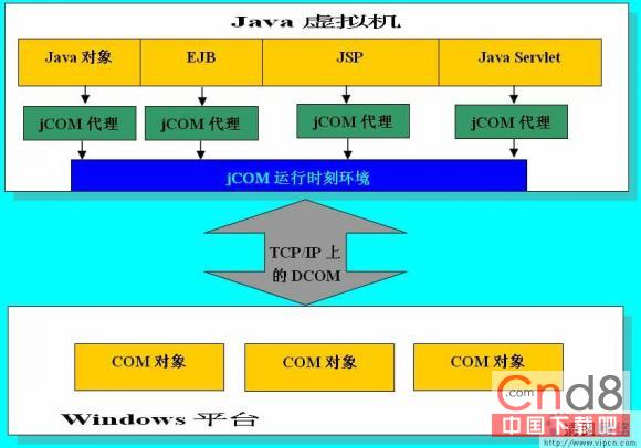 jCOM,即Java/COM桥,它是一种用软件实现的桥接机制,可以帮助Java应用程序快速访问微软的COM/DCOM组件。而且,微软的COM应用程序也可以通过这个机制访问基于Java的对象。jCOM不仅具有实现相对简单的特点,而且其最吸人的部分在于它的透明性。对Java程序员来说,COM对象看起来与其他Java对象没有什么不同。而对COM开发人员来说,远程Java对象看起来就象是本机COM组件。在这些对象中可以找到jCOM运行时刻引擎进行动态类型映射,因此从表面上屏蔽了数据类型间的差异。远程对象的数据类型被动态地转换成调用程序所使用的基元类型。对Java开发人员来说,COM数据类型表现得就象Java基元类型;而对COM开发人员来说,Java数据类型看起来就象是COM数据类型。