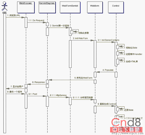Web From是Web Application Framework的要害部分,它是整个框架的核心部件,WebFrom是所有WebControl的容器,它能治理组件的的状态,维护组件的生命周期。负责协调组件和事件处理的联系。下面是用户操作一个页面,WebFrom相应的顺序图: