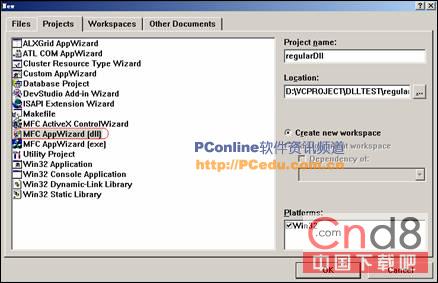 我们来一步步讲述使用MFC向导创建MFC规则DLL的过程,首先新建一个project,如图9,选择project的类型为MFC AppWizard(dll)。点击OK进入如图10所示的对话框。