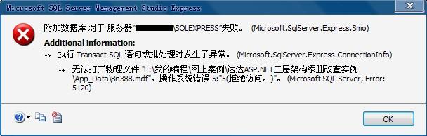 一篇关于Sqlserver2005附加数据库时出错提示操作系统错误5(拒绝访问)错误5120的解决办法 ,有碰过相同问题的朋友可以参考本文章得以解决哦。最近几天从网上找了几个asp.net的登录案例想要研究研究代码,结果在用