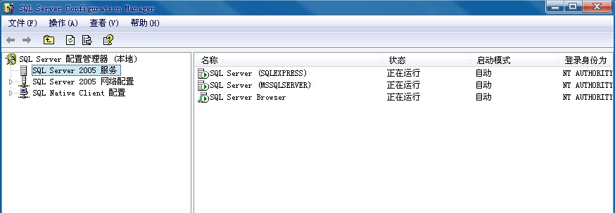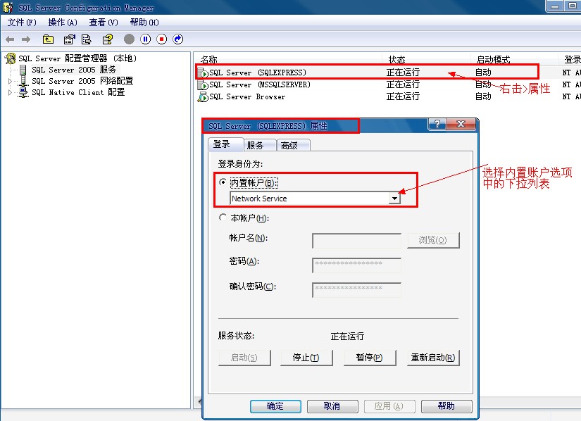 打开“SQL Server Configuration Manager”配置界面,在左侧选择"SQL Server 2005 服务",在右侧右击打开“SQL Server (SQLEXPRESS)” 的属性,在内置账户处将网络服务--”Network Service”改为本地系统--"Local System",