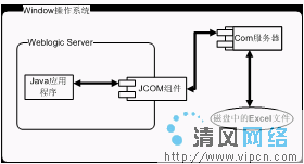 在上面的示图中,我们看到,java应用程序是通过JCOM组件来访问Windows操作系统中的Com服务器,再由Com服务器作为桥梁来存取磁盘中的Excel文件。