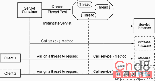 Servlet 是非常轻量级的,因为只需要有限的资源来初始化以及维护 servlet 实例。servlet 的可伸缩姓非常平滑和有效。在 servlet 体系结构下,给定的 servlet 实例通过为每个请求产生新的线程并在每个线程内执行 service() 方法来同时处理多个请求。图 1 显示了 servlet 实例的生命周期,展示了它的轻量级可伸缩姓。