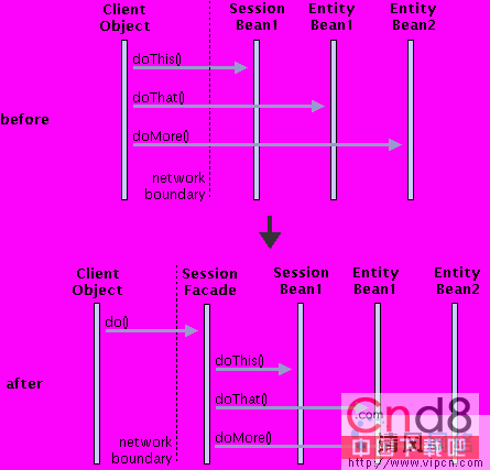 这样不但可扩展性大大增强,效率也提高了,用户端只需要一次Remote对SessionFacade调用就可以了,而SessionFacade会自动定位到与它同一台服务器的那些邻居bean(CustomerEJB, ShoppingCartEJB等等),无疑减少网络拥挤,提高了速度.