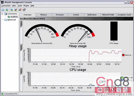观察这些无尽的GC具体统计输出是一件非常单调乏味的事情。好在有一些工具来代替我们做这些事情。The JRockit Management Console可以用图形的方式输出堆的使用量。通过观察图像,我们可以很方便的观察堆的使用量是否伴随时间增长。