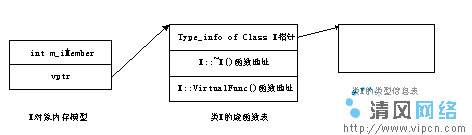 虚函数的调用稍微复杂一些,为了支持多态性,实现运行时刻绑定,编译器需要在每个对象上增加一个字段也就是vptr以指向类的虚函数表vtbl,如类X的对象模型如下图所示(本文中对此不多做解释,若想进一步了解,可以参考其它材料)。