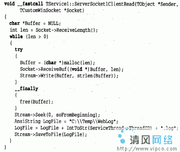 范例:这个服务具有端口号为80的TServerSocket。这是Web浏览器向Web服务器请求服务和Web服务器响应Web浏览器的缺省端口号,这个特例会在C:Temp目录下生成名为WebLogxxx.log的文本文档(其中xxx是ThreadID号)。任意给定端口只应被一个服务器监听,因此,假如具有Web服务器,必须确定它没有进行监听(该服务被停止了)。