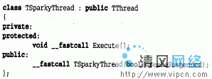 2)在程序单元的头文件中,声明一个名为TSparkyThread的TThread的新后代,它是为服务工作的线程,声明如下: