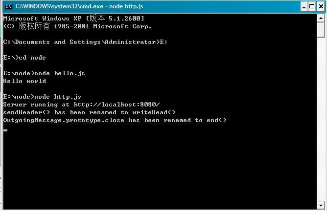 然后我们在命名台中输入命令node http.js,在浏览器输入http://localhost:8080/