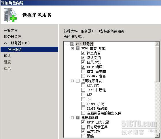 IIS 7.5被分割成了40多个不同功能的模块,管理员可以根据需要定制安装相应的功能模块,这样可以使Web网站的受攻击面减少,安全性和性能大大提高。所以,在“选择角色服务”的步骤中我们采用默认设置,只安装最基本的功能模块。