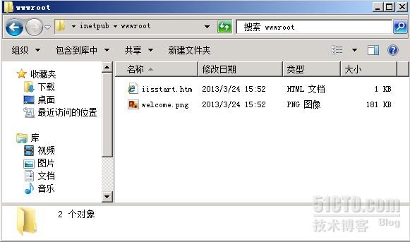 打开这个主目录,可以看到里面已经有一个名为iisstart.htm的网页文件以及一张图片,这也就是我们刚才所看到的默认网站所显示的网页。