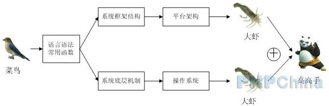 我们在掌握了一门编程语言之后,又会向两个方向发展:一个方向是向上延伸,从事系统框架结构的探索;另一方向是向下延伸,从事系统底层方面的研究,我大体画了一下这个学习演变过程的示意图。