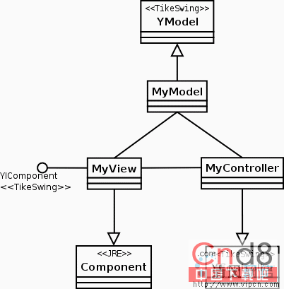 类MyModel, MyView, 和MyController由一个使用框架的应用来实现。MyModel和MyController扩展了TikeSwing的YModel 和YController类。一个视图的类可以是任何实现了YIComponent接口的java.awt.Component。