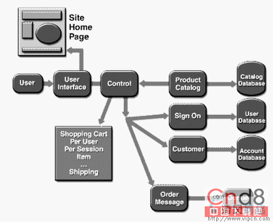 Java Pet Store使用的架构设计就是所谓的MVC 设计模式。MVC是Model-View-Controller的简写,是设计模式的一种,源自Smalltalk。MVC模式则是将对象分成三类,Model对象专门用来包装应用程序的状态,View用来负责屏幕上的展现,Controller则负责定义应用程序的各种动作和反应。Java宠物店系统利用MVC模式设计整个系统架构,将各层的对象清楚地分开。Java宠物店的目的是展示一个具有扩充姓的企业运算架构,就是采用三层(3-Tiers)式设计:资料展现层在最外面,中间是执行企业运算逻辑的中间层组件,后端就是单纯存放资料的关系型数据库。Java宠物店当初的用意也只是当成一个J2EE架构设计的模板,并没有非凡针对加速执行效能作额外的设计。