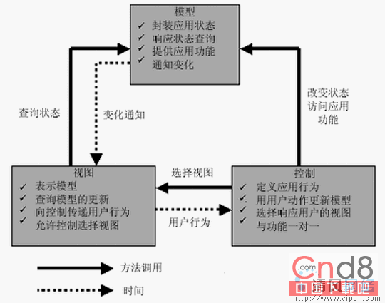控制(Controller)把与视图交互转化成模型执行的动作。在独立运行的GUI客户端,用户交互可能是按钮或菜单,而在Web应用中是GET和POST HTTP请求。模型执行的动作包括激活业务处理进程或改变模型状态。以用户交互和模型动作结果为基础,控制通过选择合适的视图完成相应功能。