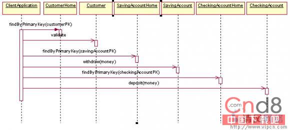 下面我们举一简单的例子来看看会话外观模式是怎样体现这些优点的。考虑一个银行系统中,顾客转帐的例子。设想这样的情景:顾客在ATM对自己的帐户做远程操作,把自己的钱从储蓄帐号转到经常使用帐号。应用中,系统首先要核实客户的身份,然后从储蓄帐户消掉要转的钱,再次在经常使用增加这部分钱。我们用三个EJB来表示这核对帐户(Customer EJB),对存储帐户操作(SavingAccount EJB)和对经常帐户(CheckingAccount EJB)操作,客户端应该遵守的操作流程可以用如下的顺序图表示:
