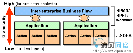BPM(业务流程治理)标准,比如BPMN(业务流程建模符号)和BPEL(业务流程执行语言),提供了一种分离业务流程的途径,那就是应用基于XML文档来描述这种分离。这种方法的另外一个好处可以在SOA(面向服务架构)基础上设计应用程序。但是,这种方法使得在web应用程序不能很好地应用action.actoin的粒度对于BPM/工作流产品来讲太低了。他们通常专注于更高的业务范围,如B2B应用程序和企业级的应用整合,而且他们假定业务分析人员会按照图1所示的方法来描述流程。但是在更低的粒度上,比如action,流程再用的可能性更大。