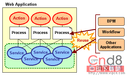 服务协调框架将直接帮助开发人员决定哪些流应该用过程XML描述,哪些逻辑应用用service实现。结果是,应用程序会基于SOA设计和开发,重用性会变得越来越好。