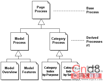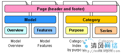 创建流程的时候,我们发现有些流可以被其他的流程共享。举个例子,我创建了4个页面,如下图3所示:模型总览,模型特性,和其他两种分类索引页面。所有的页面包含相同的标题和页脚。前两个模型页面用同一个Model对象来显示模型信息,如模型名称。后两个分类页面同样那个也是用一个Category对象。最后,每个页面有自己单独的页面处理进程。