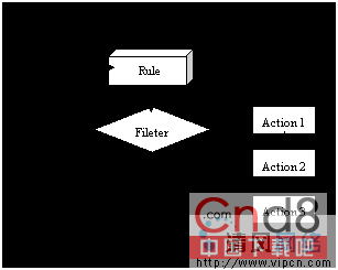 顾名思义,规则集就是许多规则的集合。每条规则包含一个条件过滤器和多个动作。一个条件过滤器可以包含多个过滤条件。条件过滤器是多个布尔表达式的组合,其组合结果仍然是一个布尔类型的。在程序运行时,动作将会在条件过滤器值为真的情况下执行。除了一般的执行动作,还有三类比较非凡的动作,它们分别是:放弃动作(Discard Action)、包含动作(Include Action)和使信息元对象内容持久化的动作。前两种动作类型的区别将在2.3规则引擎工作机制小节介绍。
