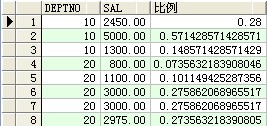 select deptno,sal,ratio_to_report(sal) over(partition by deptno) 比例 from scott.emp ;