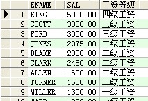 select ename,sal,case when sal>0 and sal<1500 then '一级工资' when sal>=1500 and sal<3000 then '二级工资' when sal>=3000 and sal<4500 then '三级工资' else '四级工资' end 工资等级 from scott.emp order by sal desc ;